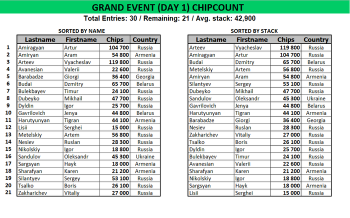 Ишхан Арсенян удвоился в префлоп оллине против Дмитрия Саковича, >, сейчас у него ~900,000. Средний стек в настоящий момент 1,320,000, в игре по прежнему 8 игроков
