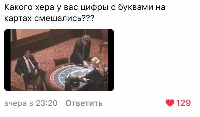 Неделю с воскресенья до воскресенья не катал, болел, вчера поиграл недолгую вкаточную сессию 6 часов, потому что восстановился еще не полностью, 7ю подряд плюсовую сделать удалось и ладно)) По игре соскучился за 6 дней, вчера смотрел "Что где когда", даже удалось ответить на решающий вопрос, который не взяли знатоки, что для меня редкость, чаще отвечаю только на то, что и знатоки, потому что такие вопросы как правило полегче)) Интересный момент произошел на другом вопросе, в 13 секторе выпал вопрос: "В, Д, К, и Т с цифрами смешались где?" Меня понесло не в ту степь, я стал думать о химических элементах и их формулах (CO2, H20, O2 и т д), но понимал, что версия не подходит, потому что там другие буквы, а ничего правдоподобнее придумать не мог, знатоки ответили про клавиатуру кнопочного телефона, после чего ведущий у знатоков в зале спросил знает ли кто-то ответ, ответа никто не знал, ответом оказались...карты . В этот момент все знатоки схватились за голову, я тоже сидел в небольшом шоке, потому что я то тем более должен был отвечать на этот вопрос, но в общем получилось забавно, ни я, ни один знаток в зале (которых было человек 10 помимо сидящих за столом), никто не ответил на эту детскую, как оказалось, загадку. После эфира кто-то в комментах группы ЧГК выложил эту гениальную шутку от которой я пару минут смеялся в голос