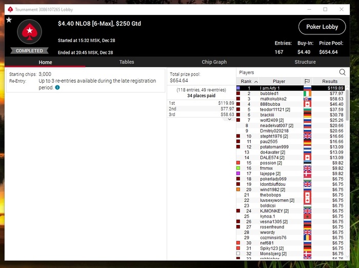 Перестал делать скрины, в какой-то момент понял, что они какие-то все однообразные получаются, но сегодняшний оставлю здесь для архива, все-таки топ-3 в одном из любимых турниров нечасто случается, тем более что их всего 2 в неделю идет: Заметил за собой, что перестал реагировать на результаты, стало неважно выиграл или проиграл дорогой флип и вообще стало всё равно на исход любой раздачи, на качестве игры не сказывается, потому что я итак всегда делал акцент на качество принимаемых решений, а не на выигрыш оллинов, но на финалках и в ноках от важных монеток все равно периодически сгорал, а сейчас перед выставлением в голове мысль: "Я сыграл правильно, а остальное от меня уже не зависит", в этом же турнире неделю назад отлетал с тузами на 7 месте и не было ни капли эмоций, даже за оллином не следил, надеюсь, что мозги встали на место навсегда и я смог осознать незначительность краткосрочных результатов, а важность только качественной игры. На ГТ как-то совсем нечего почитать стало, наверно всю нужную инфу я уже прочитал и изучил, а нового ничего не появляется, да и в своем блоге реже стал писать, не хватает для этого желания, потому что один пост - это минут 10-20 времени, гораздо с большей охотой я это время погуляю, почитаю или пообщаюсь по телефону. Тем временем уже 6 плюсовых сессий подряд, может сейчас пришло время сделать 10?