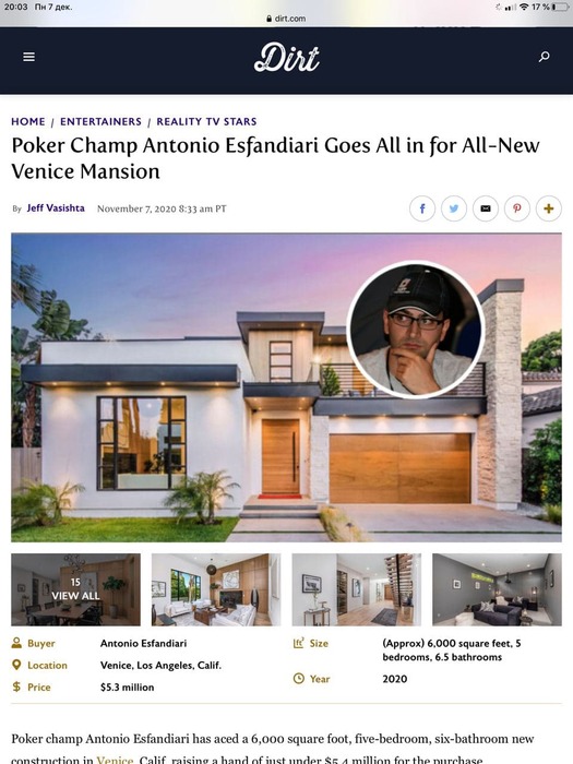 В заключении я хотел бы сказать пару слов об Антонио Эсфандиари. Антонио никогда не пробовал рубиться с акулами в онлайне. Нет, он очень веселый парень, который попадал в самые лучшие составы, в которых сколотил приличное состояние. А сейчас он спокойно проводит время с семьей. Я думаю, что мы все понимаем, какой путь для себя выбрал Антонио) Из уст регуляров онлайн покера термин "бамхантер" часто звучит с презрением. И, вероятно, к Антонио они бы отнеслись без особого уважения. Но я просто отправлю фото дома, который недавно Антонио купил за 5 миллионов. Мне кажется, что он богаче большинства топ регов и, вероятно, счастливее. Поэтому, мне этот путь тоже наиболее близок.