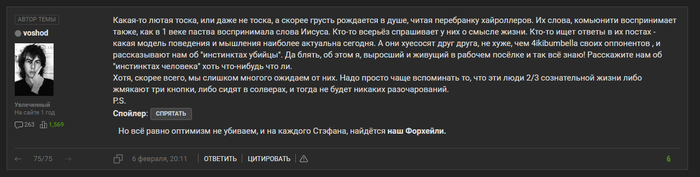У меня пару раз спрашивали, почему я не бываю в популярных дневниках) Честно, я просто не знаю, что там делать) То есть писать там потому что там сейчас все пишут...Ну это такое себе. Мне интереснее зайти и пообщаться с человеком, у кого небольшой дневничок и кто радуется каждому сообщению в нем. И больше всего меня поражает, когда ребята с форума начинают у топ регов спрашивать какие-то вопросы про жизнь и т.п. Ну то есть ребята одарены и добились большого успеха, за что им уважение. Но это даже близко их не делает авторитетами в моих глазах.