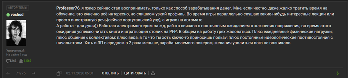 Про полезность покера для общества сказано уже много на форуме. В моих глазах желание работать и, как следствие, чувствовать себя выполнившим некий долг, достойно уважения.