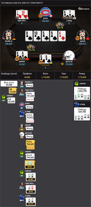 Есть вот такой недоезд в топ 47 ГГ мастерс, где 7к за первое, перепушил двоих коротких, но там у Кым Чын Ына нашлась рука еще лучше))) Ладно бы чел бы регом, отдал фишки и забыл, но фишу заливать, который проиграл 30к меньше чем за 1000 туров обидно, особенно, осознавая, что он потом эти фишки какому-нибудь парню удачно пристроит.. На винамаксе этот месяц идет так, на графике перебор, но что-то вообще не чувствуется))) За депозитом хожу как на работу Из запоминающегося - отобрался в финальный день фазы 10 Евро на Испанских старзах с гарантией 200к+, раза с 9, лол)) Стек около 50бб. Завтра продолжаем в стандартном режиме - в зал+теория, ICM3, ну и катать) Ох эта интересная жизнь гриндера) Всем ГЛ, да прибудет с вами сила)