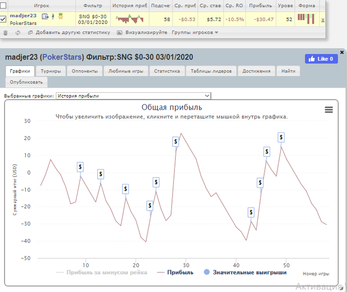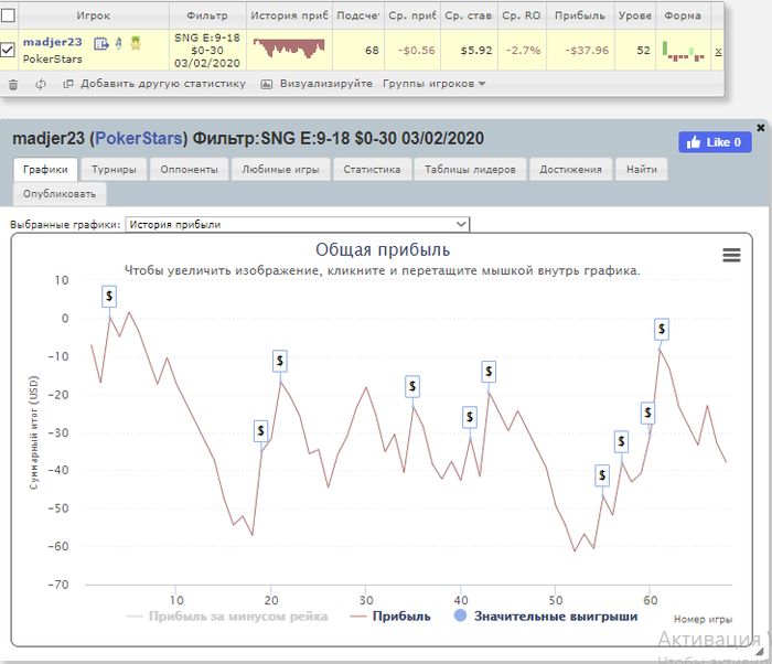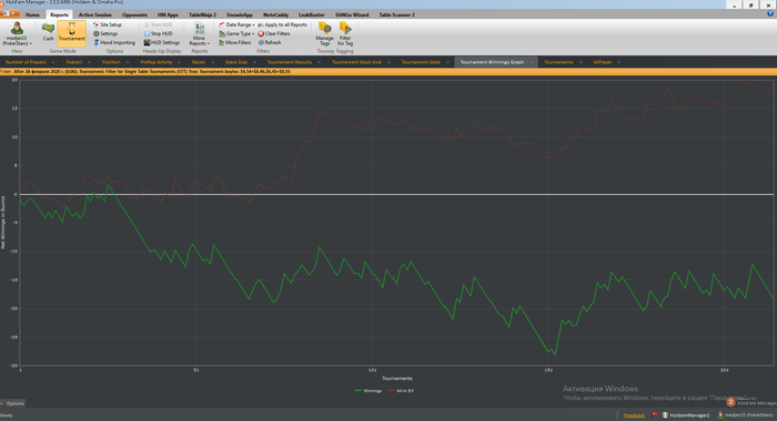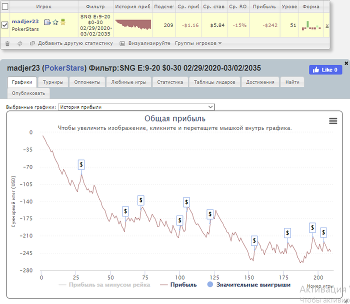 Общее количество отыгранных турниров - 209/5000 Итоговый профит - -242