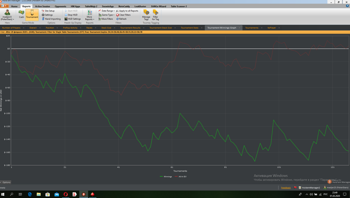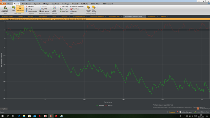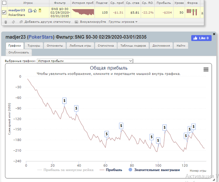 Общее количество отыгранных турниров - 135/5000 Итоговый профит - -204