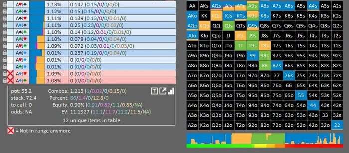 Никого не смутило, что у чела тут 3бет сб вс бтн 8.93% и AJo как бы фолдить надо(или может 4бетить с очень редкой частотой)? Тут ещё в солвере диап задаётся, что там KJo,77,66... серьезно?)