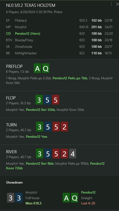 Как сыграно: я бы ещё понял фолд, если бы это был прямо нит-нит, который запушил терн на наш цбет. Но зачем руку из велью ренжа уводить в чекколл терна, чтобы потом на, по сути, бланке, играть чекфолд? Опять же: если по каким-то ридсам думаешь, что там ну вообще 0 блефов, никогда нет пуша с рукой слабее (условная КД) - играй просто сам бет-бет-пуш. Это точно плюсово, и это точно плюсовее линии, которую выбрал ты
