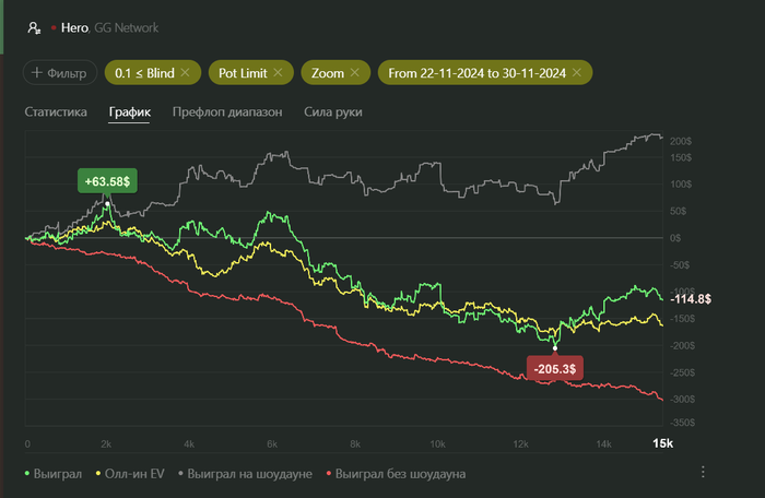 Metalrag,логика в пло точно другая,поэтому многие слабые омашисты или начинающие имеют такие графики,как у нас.Мы ставим там,где ставить не надо и часто выбиваем то,что выбивать не надо.Я это четко увидел на стримах Чеснакова.Хороших чеков и чек рейзов у меня мало,зато дофига ненужных плохих ставок и коллов за счет чего просто сливаешь весь профит по красной и все.