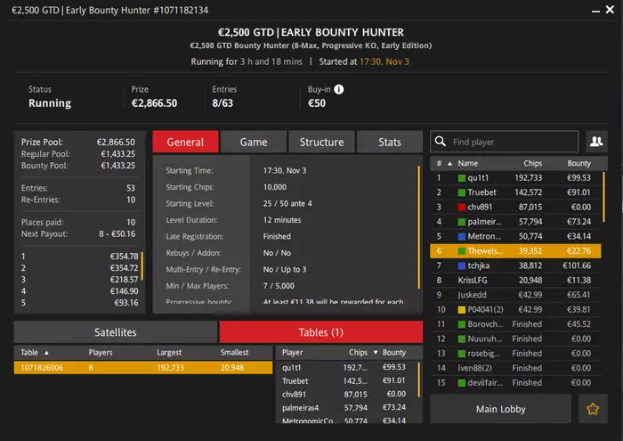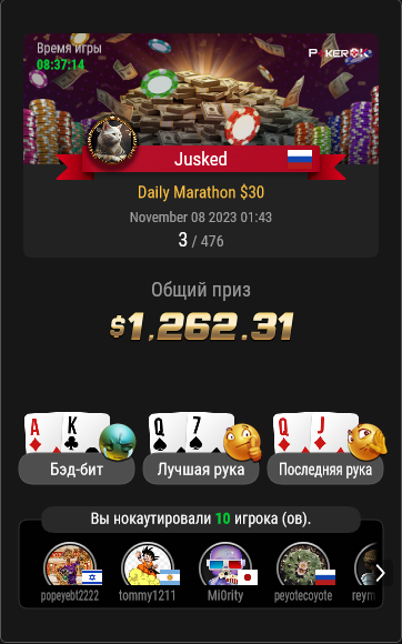 Турнир, конечно, максимально реговский. В дипе любителей почти не остается, а реги аби 40-50 постоянно изъебывают своими мелкими трибетами по 4,5-5,5бб в стеках 30-35бб. Вряд ли снова буду туда прыгать, не смотря на хорошую структуру. Месяц пока -300$.