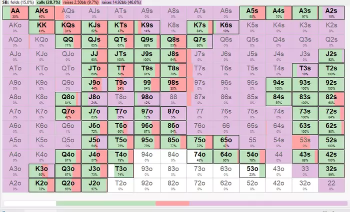 Или вот, например, стратегия для чипака c SB в 15бб при некой стадии турнира, при определенном размере баунти, для сети Ipoker.