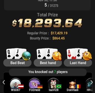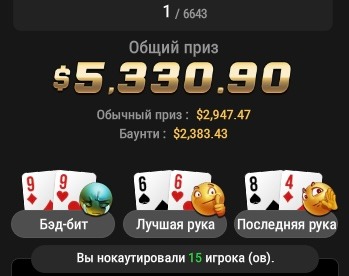 И, конечно, будет несправедливым не выделить занос Максима Sanaratione. Он занял первое место в Bounty Builder за $55 на PokerStars. Первое место добавило к его банкроллу $3,493 призовых плюс баунти.