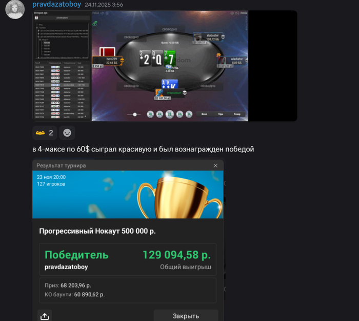 Gunselger вытащил в турнире сундук на €65,000 и рассказал нам о внезапно свалившемся на голову бэсткеше, его покерном пути и планах на будущее. Почитать можно тут: https://forum.gipsyteam.ru/index.php?viewtopic=168663&view=findpost&p=8032454