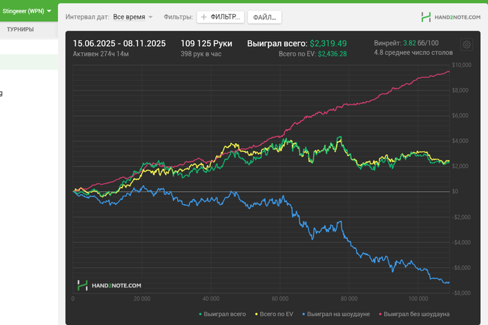 На ВПН в этом году был чувак, из РФ кстати, он появился летом на нл50. Начал сразу разъёбывать. Я это я знаю, потому что я видел, как он катал все столы подряд. Есть свободное место - он садится. Ему было плевать - есть фиш, нет фиша. Просто садился и разъёбывал. В июне он кажется появился. Он очень быстро подключил нл100. И там продолжил также точно катать, просто видно было чувак кайфует от процесса, от своей страты. Красная в небо, синяя в ноль, вр двузначный или около того. На дистанции уже 50-60к рук.