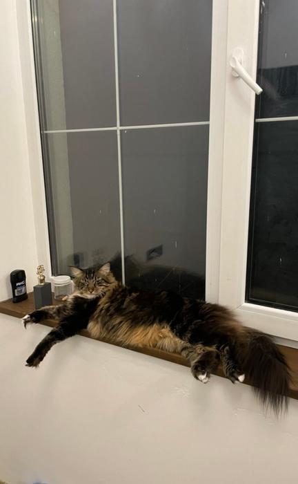 Слышу резкий звук. Этот придурок видать кого-то в траве увидел и сиганул в окно. Тут первый этаж, под окном отмостка, на которой еще брус лежит и всякий строймусор, так что невысоко. Ну я за ним нырнул тут же, прям в носках не думая. Он в траву, испугался меня. Я за ним, он от меня, оббежал по кругу и запрыгнул обратно в окно, а я там стою в каких-то буераках, темно, ноги мокрые, там снег\глина\вода все вперемешку, вскрабакался обратно, закрыл окно, пошел в ванную мыть ноги и переодевать носки. Возвращаюсь через 5 минут, слегка офигевший от произошедшего, а этот черт уже лежит на том же подоконнике с такой физиономией, будто ничего не было и вылизывается лениво: