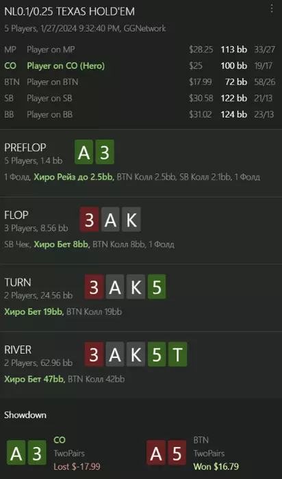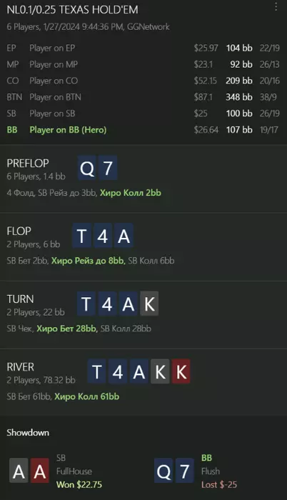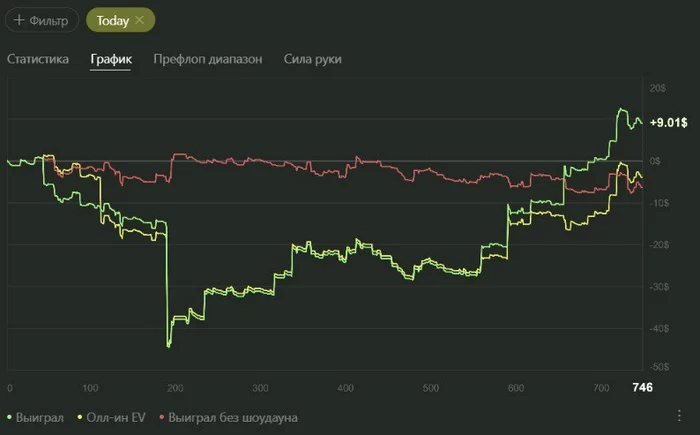 В начале сессии глупо съездил префлоп АК в АА, ещё одна раздача сомнительная была, но в целом самому понравилось, как играл.
