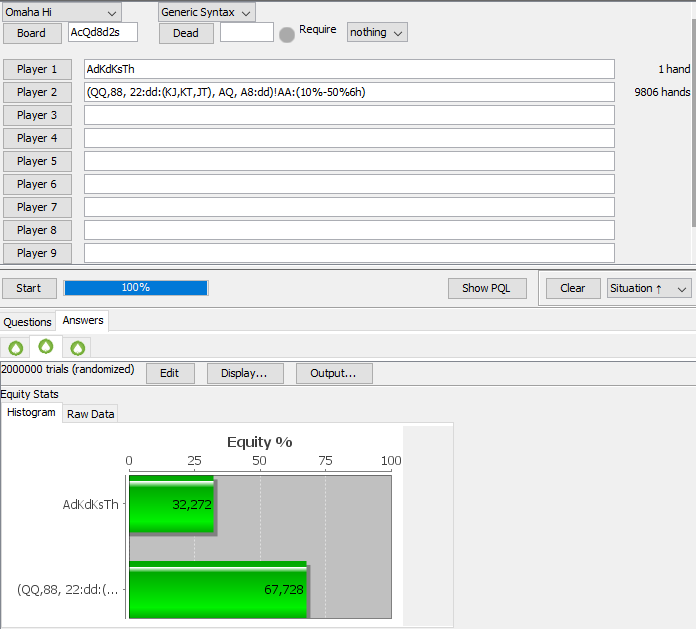 На ривере SPR 0.8 идея ставить 0.5-0.66 пота и выкинуть на пуш так себе идея. Как предложил Rz40 мне нравится, твои рассуждения о том что стрит бы себя проявил правильные, только вывод неверный. На ривере мы можем добрать только очень маленькой ставкой,в идеале спровоцировать блеф. Если бы я сейчас эту раздачу играл, то наверное 1/10-1/3 бы поставил.