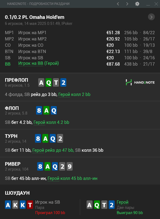 Sergei1210 @ 14.05.25Поэтому 50-66% норм было бы поставить. На рейз естественно сдаемся,опп тайтовый 21/14,если зарейзит блефов там 0.