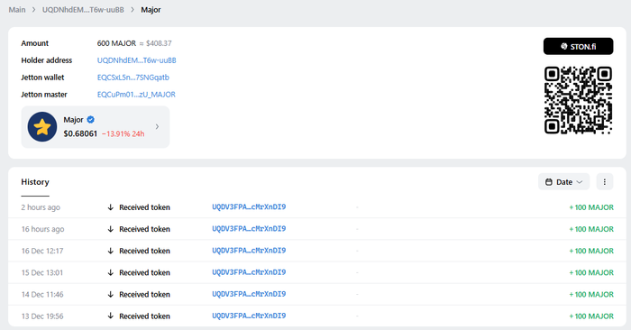 AAlexPlayer @ 14.12.24Попутно по прикколу запустил небольшой челлендж с покупкой по 100 токенов $Major в день до конца 2025 года. Всем кому интересно, можете отслеживать по данному кошельку - https://tonviewer.com/EQDNhdEM2T5q3SSIfqLH8m697JgEBnRaMaHqr6VRT6w-ur2E. Никаких гарантий, что не забью болт в процессе не даю, я тоже простой человек как говорится😂