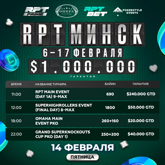 ⚡️В 11:00 начнется $690 RPT MAIN EVENT (Day 1A) ($240 000 GTD). В первом игровом дне сыграют 16 уровней по 40 минут, весь игровой день будет доступна поздняя регистрация.