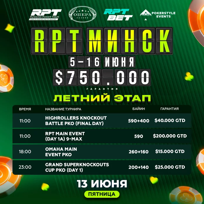 🔥 В 11:00 начнется $590 RPT MAIN EVENT (Day 1A) ($200 000 GTD). В первом игровом дне сыграют 16 уровней по 40 минут, весь игровой день будет доступна поздняя регистрация.