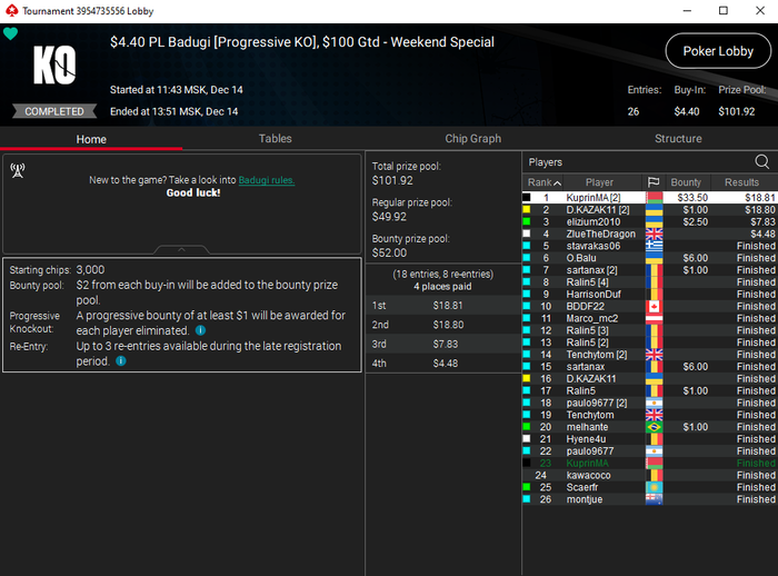 Плюс дважды в день холдемные фрироллы на $100, каждый собирает человек 30-40 и половина из них в ситауте.