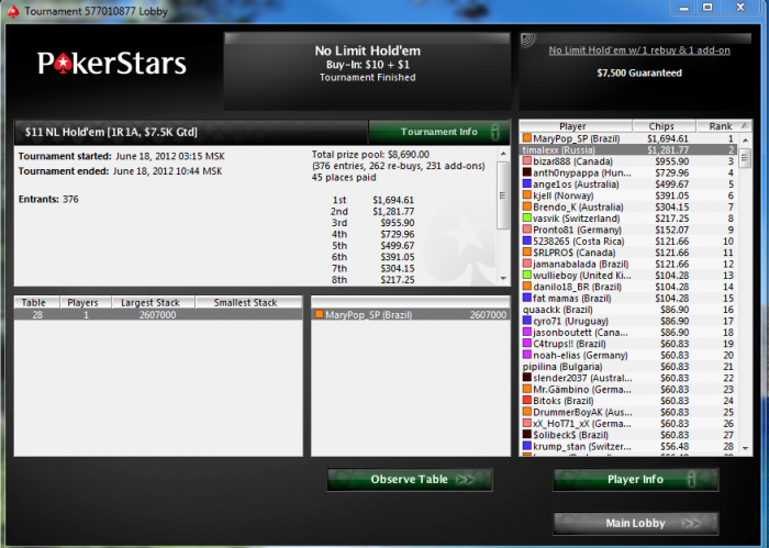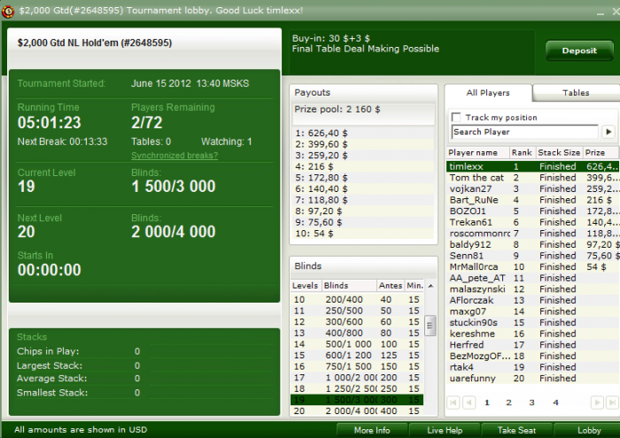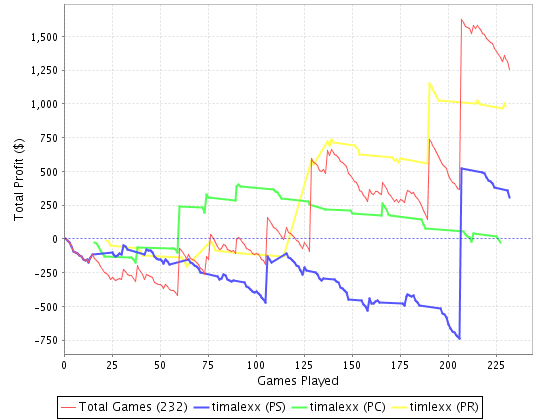 timalexx @ 19.6.2012 Промежуточный отчет. Шарскоп потерял занос на 888 на 850$. Я им писал, говорят, что ничего поделать не могут. Пока результаты такие. Я доволен, но надо увеличивать количество турниров. Надеюсь,что к концу месяца профит только увеличится!
