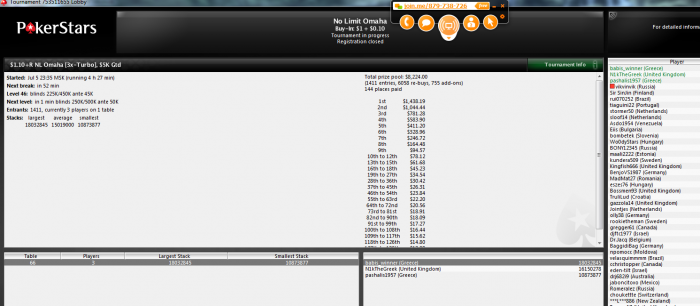 В даблдьюсе вылетел 17х какимто, блядь ну как ебло последнее сыграл и въебался в стрита с топ парой, сам виноват, но все равно ФТП подонки, что не дали мне нажить дохера денег. Всем удачи за столами. Пойду лучше в баньку.
