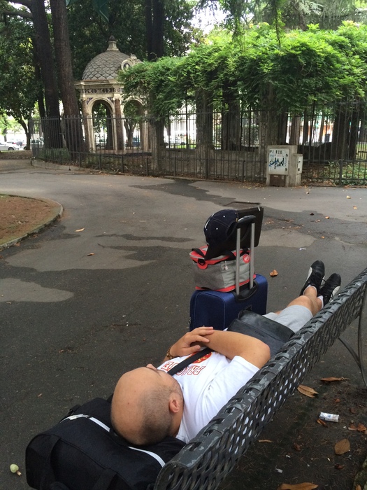 В Савону мы приехали очень рано около 9.00 утра , посадка у нас была с 12.00 , с чемоданами не торопясь шли в сторону порта , в одном из парков родной прилег подремать на пол часика ( погода была ветреная , гремел гром ) Темке это совсем не мешало )))