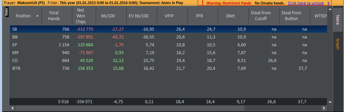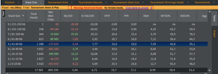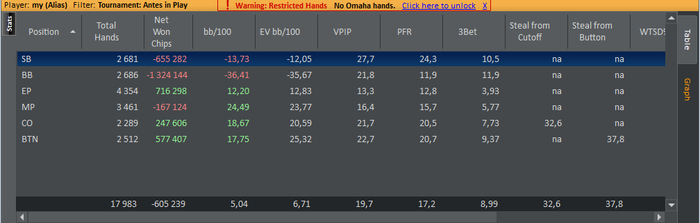 SB: 51.95 BB (VPIP: 30.95, PFR: 21.95, 3Bet Preflop: 6.67, Hands: 43)