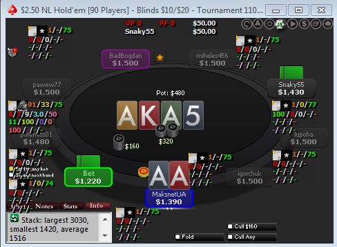 MP: 13.79 BB (VPIP: 14.39, PFR: 10.91, 3Bet Preflop: 2.86, Hands: 285)