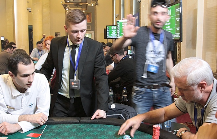 Вадим Кагарманов во время раздачи забрал карты у блайндов на столе №6 и объявил им пропуск двух розыгрышей за разговоры по телефону во время раздачи... Игроки начали было возмущаться, но на них тут же зашикали, - и они успокоились. Правила едины для всех!