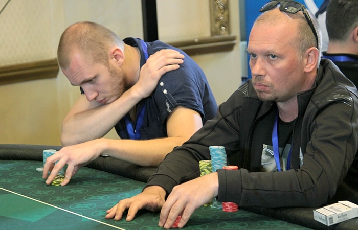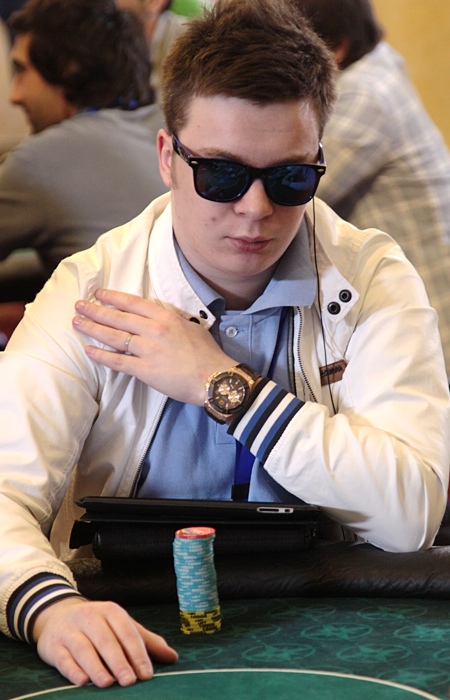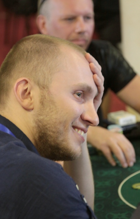 Илья Андреев, который начал второй день со стартовым стеком, уже несколько раз ходил в олл-ин. Безрезультатно - все пасовали.