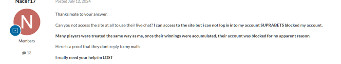 "Я могу зайти на сайт, но не могу войти в свою учётную запись. Со многими игроками обошлись так же, как и со мной: как только их выигрыши были накоплены, их учётные записи блокировались без видимых причин. Вот доказательство того, что они не отвечают на мои письма."
