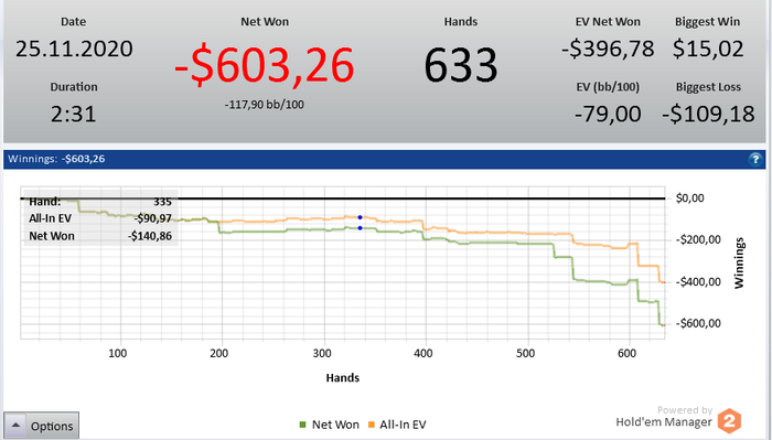 В ноябре сыграл всего 9 часов и ноябрь получился в - 600, первый мой минусовый месяц в этом году. В декабре я уже набрал обороты и сыграл целых 20 часов к настоящему времени, но тенденция не изменилась и я продолжаю минусовать, чувствую себя очень слабо, проигрываю почти каждый крупный банк, складывается ощущение что я потерял нить игры и врядли уже смогу играть как раньше, а может это просто стрик, не знаю. В общем пока наверно это моя самая крупная просадка с пика за все время игры в покер, отключил полностью сотку потому что там опы видят мои карты, цель играть полтос до той степени пока я не отобью этот минус. Печально что под конец каждого года я всегда отыгрываю в минус , когда вроде бы должны быть такие хорошие составы.