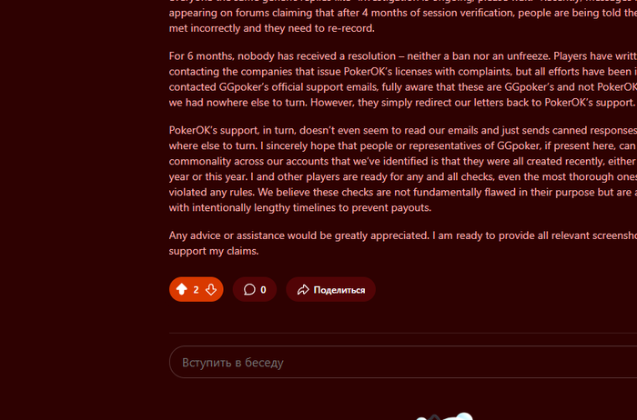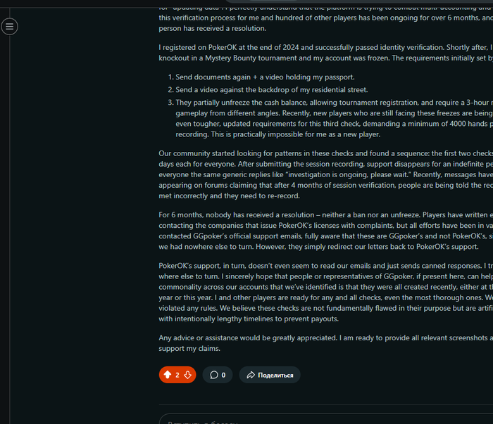 Кто также как и я столкнулся с заморозкой на покерке или просто хочет помочь, я решил попробовать написать посты в реддите в сабредитах ггпокер и покер, кто может был бы рад если бы вы тыкнули стрелочку вверх, вдруг кто нибудь из представителей заметит, либо просто в англоязычном комьюнити начнут обсуждать это.