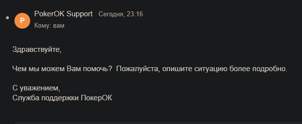 Обработав вашу заявку, ПокерОК передаст информацию платежному провайдеру. В большинстве случаев поиск платежа займет не более нескольких дней, но в редких случаях может затянуться до нескольких недель. Пожалуйста, не отправляйте повторные запросы в саппорт чаще, чем раз в несколько дней, это не ускорит процесс. Спасибо!