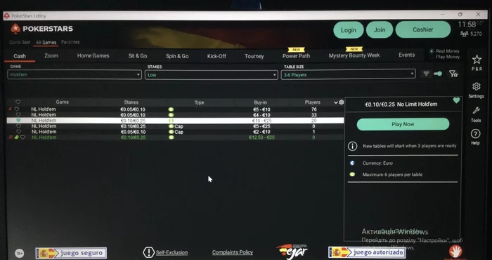 Когда нажимаю сесть за стол, то выскакивает это сообщение, где вверху написано «установите игровые лимиты»