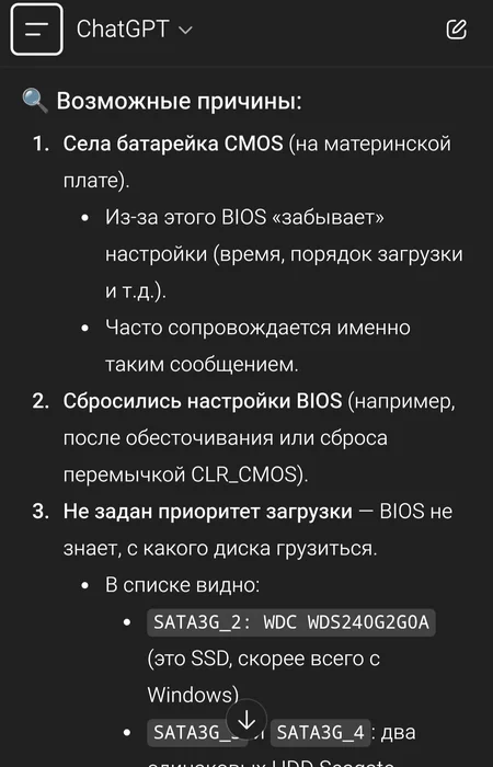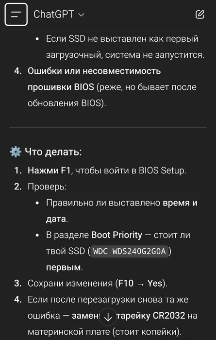 Надо попробовать заменить на новую, может совсем сдохла, так-то вся аппаратная часть грузится и пишет что настройки Биоса сбились и надо их выставить. Вот показал ещё скрин ЧатЖПТ и что он думает: