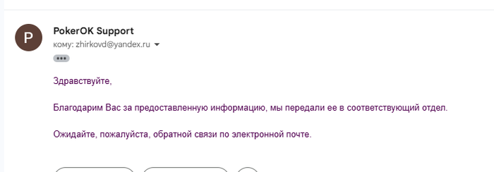 Добрый день. Попросили меня продублировать свою историю тут. Баланс моего аккаунта на PokerOK был временно «заморожен для верификации». Опишу краткую историю своей игры. Зарегистрировалась в начале 2025 года, пополнила счёт на 100 баксов, играла в основном в R&C, как любитель. Выполняла задания по акции «Медовый месяц», за одно задание был приз в виде билета на турнир стоимостью 50 баксов, в этом турнире я заняла 11 место, что принесло мне 1690 долларов. Текущий баланс около 1800 долларов. В R&C я сыграла около 25 тысяч рук. До недавнего времени я не верифицировала аккаунт, так как для игры это не требовалось. Однажды мне пришло уведомление, что неплохо было бы пройти верификацию, что я и сделала. Отправила паспорт и подтверждение адреса в виде выписки из банка, прошла верификацию, всё в порядке. 12–13 июня я зашла в кассу, чтобы узнать, как мне выгоднее вывести деньги, смотрела, сколько мне могут отправить в биткоинах, USDT и на российскую карту. 15 июня 2025 года мои средства заморозили с требованием повторной верификации, но с видео, где я держу паспорт. Затем потребовали подтвердить адрес, потом — поиграть 2,5 часа с видеозаписью. Все эти требования были мной выполнены. Видео с игрой я отправила 20 июля. Сейчас прошло уже 3 месяца с момента отправки мной видео и никаких точных ответов от поддержки сайта я не получаю. Ответ один - ждите, идет проверка. Мой ник на PokerOK - mrsTRUEten.