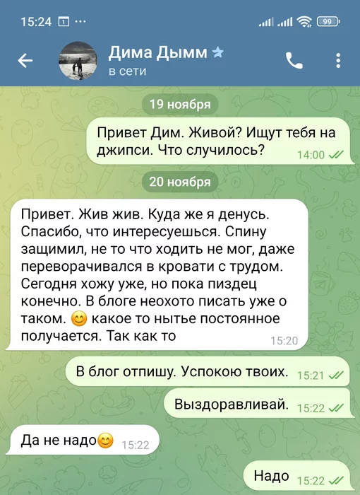 Рад, что у Димы всё относительно в порядке, и не я один. Ждем возвращения.