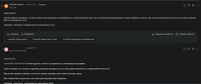 Если баланс не пополнился в течение 30 минут, напишите в саппорт и предоставьте чек (где будет видна сумма, время и получатель). Cвязаться со службой поддержки ПокерОК можно:
