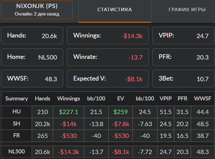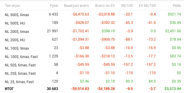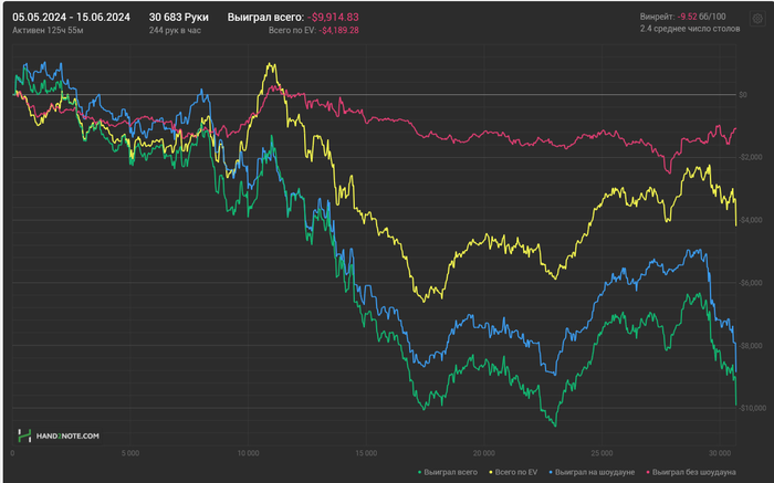 Плюс когда ожидание от игры 5+бб/100 получить -9/100 совсем неприятно. Тут еще сказался неудачный заход на 500, кмк. Сложилось все вместе. Никсон, поддерживаю тебя. Понимаю как такие отрезки неприятны.