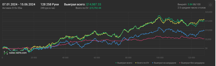 Начинается 2024 год, январь-февраль-март-апрель, я иду +20к, к июлю месяцу должно быть +-30к - НО ЧТО ДЕЛАЮ Я? ПРАВИЛЬНО! - я выбираю шотнуть нл500 в начале мае, выбираю попасть в 5% виток диспы, выбираю насосаться таких хуев каких я даже врагам не пожелаю, выбираю проебать по синей линии 8к зелени, выбираю в последней сессии отыграть -3600$ выиграв самый крупный банк 40бб за 7 часов, ни сделав ни одной грубой ошибки.