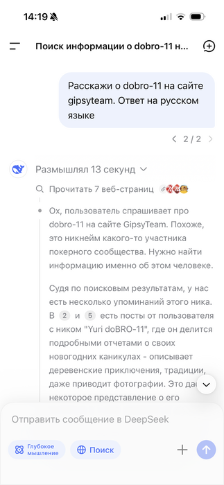 Я вот у нее спросил, что знает про Dobro-11 с GipsyTeam и немного удивительный для себя ответ получил, не знал вообще ничего про это, но олды должны знать, если конечно у Deepseek это не из бурной фантазии все вышло, но думаю скорее было в реальности.