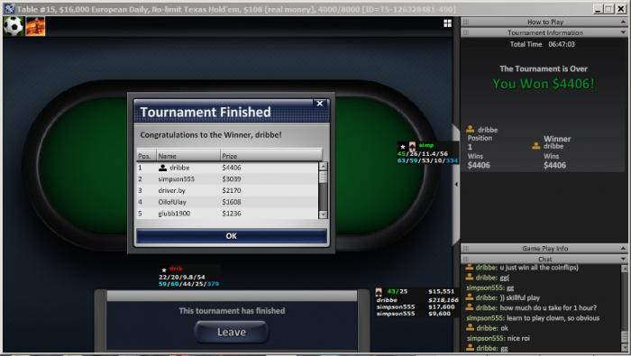 Укрепив броню ауры, на финстол вышел со средним стеком и с Сергеем из Винтим, несколькими регами... и чудо-человеком с профитом $600к в онгейме и пати без единого мегакрупного заноса... Почему чудо-человек? Ну хотя бы потому, что играет он со статами 35-20...играет часто лимп-фолд и т.д. Вначале у меня в скайпе появился JGoose, который, увы, проиграв койн, вылетел на предфиналке...а вместе с ним у меня появились подряд КК, АА и АА. И 2 из этих 3х рук мне оплатили. Я стал чипаком с двойным средним стеком... Однако потом в неравной битве с фишом, демонстрировавшим Старуха-стайл, фишек немного раздал... карту отрезало (грех жаловаться, после описанной выше тройной связки), а кто-то постоянно пушил. Но, тем не менее, местный "Старуха" скоро ушел, сначала дав рейз 10к и, разумеется, по шансам закрыв на треть стека пуш от Сергея 67к на офф. Причем, он угадал: у driver.by были только . Но 55 выиграли. Потом ему раздали ДД в КК против того самого топ-рега золотой звезды симпсона555, потом ему же он проиграл с 44 против А7. Вообще симпсон был непобедим. Он выиграл 7 койнов из 7ми, в том числе и у меня в 3макс, где мы оказались втроем с ним и с Сергеем. А потом вскрыл блеф Сергея на стек, с чем ему помогли стандартные для него 2 пары с флопа... Сергей закончил третьим.