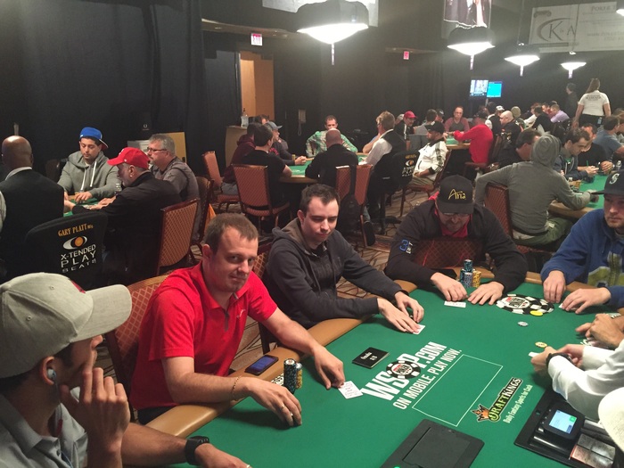 Костя и Антон играют за одним столом с Большим Филом (кстати, он ростом под два метра), пока счёт по браслетам 14:1, не в нашу пользу. Работаем! #HORSE