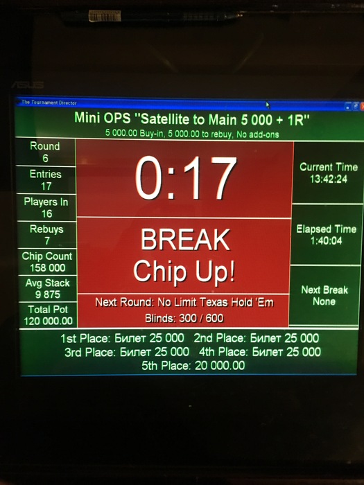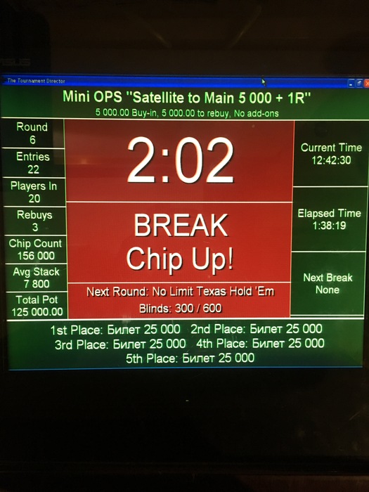11:00 Turbo Satellite to Main Event в формате 1 Rebuy по 5 000 руб. Гарантия 75 000 (3 билета) _ стартовый стэк 6 000 _ стэк на Rebuy 8 000 _ поздняя регистрация 6 уровней _ Rebuy можно сделать тоько один раз в любой момент и на любое кол-во фишек в течении первых 6 уровней _ длительность уровней по 6*15/12 мин