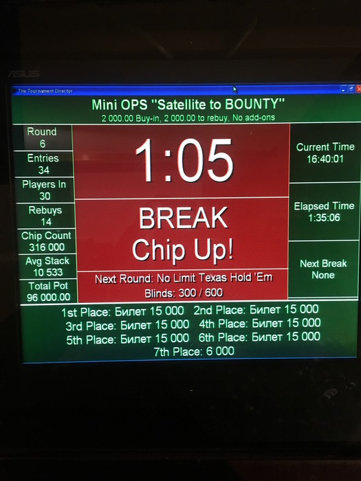 15:00 Turbo Satellite to BOUNTY в формате по 2 000 руб. Reentry Гарантия 30 000 (2 билета) _ стартовый стэк 6 000 _ стэк на Rebuy 8 000 _ поздняя регистрация 6 уровней _ Rebuy можно сделать в течении первых 6 уровней _ длительность уровней по 6*15/12 мин