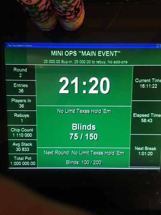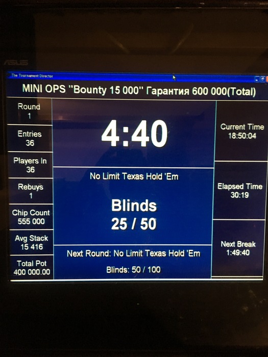 18:00 турнир BOUNTY по 15.000 (bounty 5.000) Гарантия 600.000 (общая) - стартовый стэк 15.000 - стэк на Rebuy 15.000 - поздняя регистрация 8 уровней - длительность уровней 8*35/30 мин
