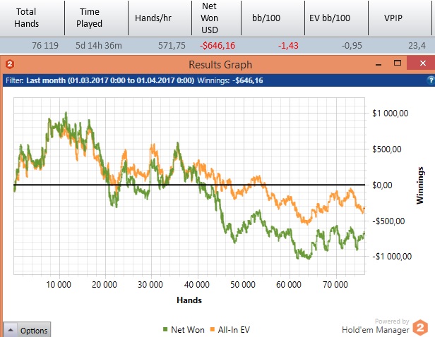 также есть у меня славная история к приметам покериста. иду я как-то с зала и вижу гривна лежит на полу.. прошла мимо, остановилась, повернулась... вспомнила, мне в школе кто-то рассказывал, что деньги любят почтение - надо поднимать,если нашел, ну подумала, что подниму и отдам позже кому-то в переходе.. и благополучно забыла. случилось это точно не скажу на каком отрезке на графике, но заливала я потом знатно, ее и на скриле попала на деньги.. и вот через какое-то время нахожу ее в кармане и вспоминаю, что получается зажала.. вспомнила пост парня одного про карму, зажатые 200 рублей и даунстрик.. и подумала, что от греха подальше положу где-нибудь и пойду домой апстрик колдовать... кстати, с тех пор немного отбилась а 31-ого еще и 300 баксов занеслось, на графике их нет)